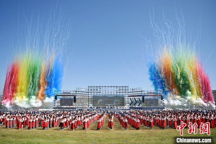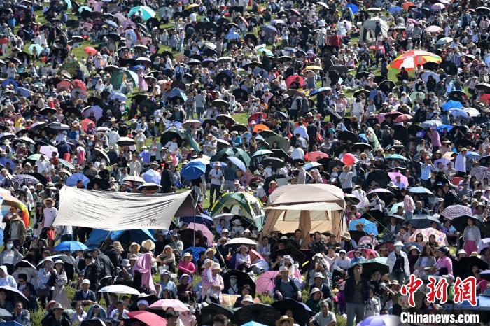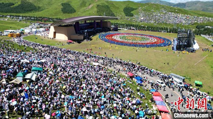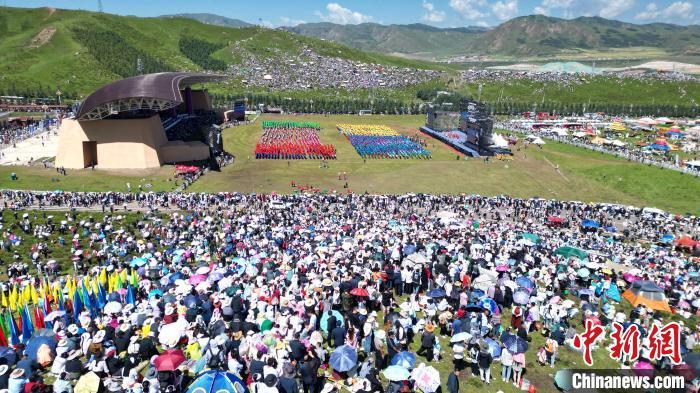 8月4日,第22屆九色甘南香巴拉旅游藝術(shù)節(jié)在甘肅省甘南藏族自治州當周草原開幕。人們身著節(jié)日盛裝載歌載舞、歡聚一堂,馬隊巡游、千人鍋莊舞等活動精彩上演。九色甘南香巴拉旅游藝術(shù)節(jié)既是民眾浪山聚會的節(jié)日盛會,也是展現(xiàn)發(fā)展成就、擴大對外開放的重要窗口,更是展示民俗文化、促進廣泛交往交流交融的有效載體。圖為開幕式現(xiàn)場。中新社記者 九美旦增 攝