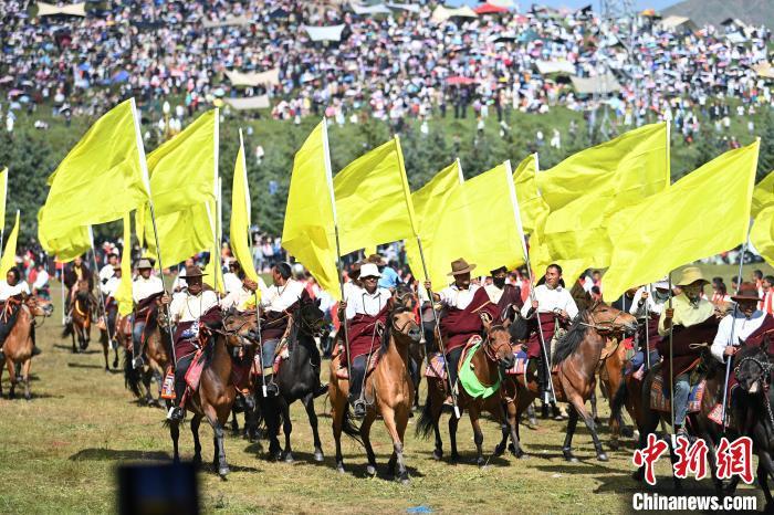 8月4日,藏族騎手在當周草原上表演馬隊巡游。當日,第22屆九色甘南香巴拉旅游藝術(shù)節(jié)在甘肅省甘南藏族自治州當周草原開幕。人們身著節(jié)日盛裝載歌載舞、歡聚一堂,馬隊巡游、千人鍋莊舞等活動精彩上演。九色甘南香巴拉旅游藝術(shù)節(jié)既是民眾浪山聚會的節(jié)日盛會,也是展現(xiàn)發(fā)展成就、擴大對外開放的重要窗口,更是展示民俗文化、促進廣泛交往交流交融的有效載體。中新社記者 九美旦增 攝