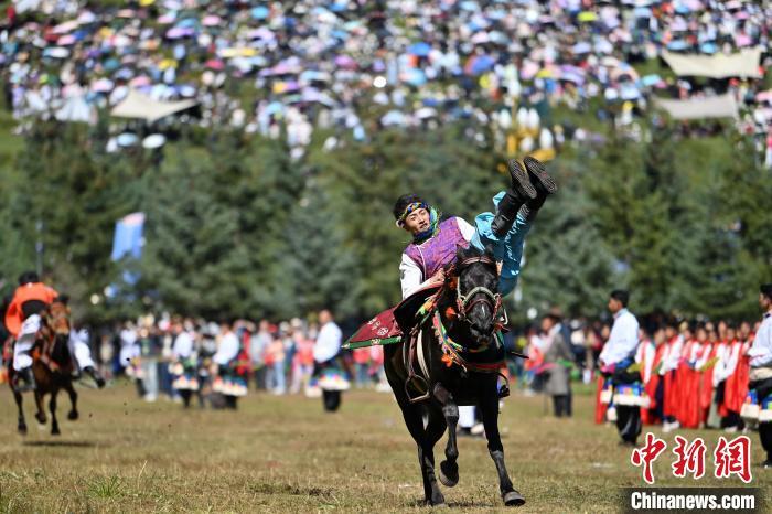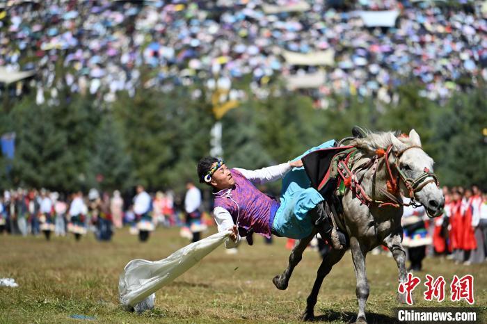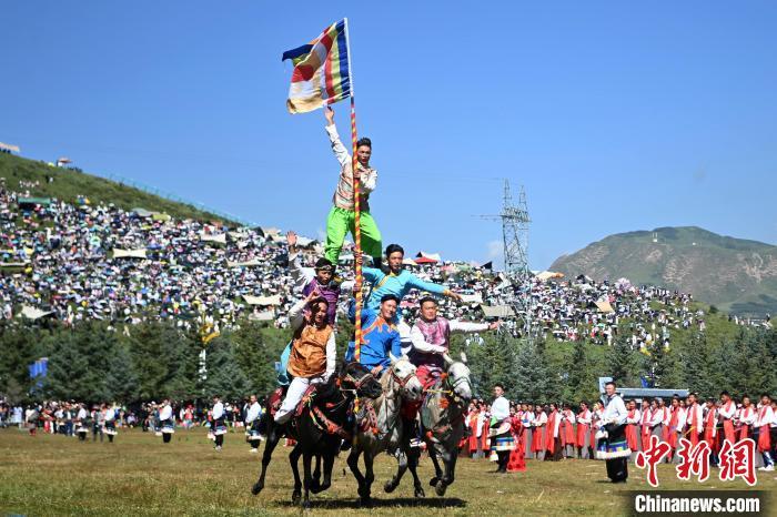 8月4日,藏族騎手在當周草原上表演馬術(shù)。當日,第22屆九色甘南香巴拉旅游藝術(shù)節(jié)在甘肅省甘南藏族自治州當周草原開幕。人們身著節(jié)日盛裝載歌載舞、歡聚一堂,馬隊巡游、千人鍋莊舞等活動精彩上演。九色甘南香巴拉旅游藝術(shù)節(jié)既是民眾浪山聚會的節(jié)日盛會,也是展現(xiàn)發(fā)展成就、擴大對外開放的重要窗口,更是展示民俗文化、促進廣泛交往交流交融的有效載體。中新社記者 九美旦增 攝