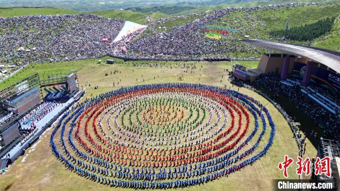 8月4日,第22屆九色甘南香巴拉旅游藝術(shù)節(jié)在甘肅省甘南藏族自治州當周草原開幕。人們身著節(jié)日盛裝載歌載舞、歡聚一堂,馬隊巡游、千人鍋莊舞等活動精彩上演。九色甘南香巴拉旅游藝術(shù)節(jié)既是民眾浪山聚會的節(jié)日盛會,也是展現(xiàn)發(fā)展成就、擴大對外開放的重要窗口,更是展示民俗文化、促進廣泛交往交流交融的有效載體。圖為開幕式現(xiàn)場千人鍋莊舞表演。(無人機照片)中新社記者 九美旦增 攝