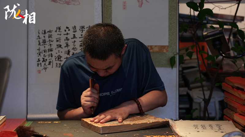 立秋前夕,在“脈望閣”書房里,安靜地只聽見屏氣凝神的呼吸聲,專業(yè)的刻刀、常用的手工宣紙、幾塊梨木板,靜寧縣傳統(tǒng)雕版印刷非遺傳承人李安樂正一絲不茍地在有繪畫的梨木上進(jìn)行雕刻作品。