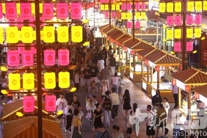 2024年8月17日,游客在甘肅省敦煌夜市游覽。進入暑期以來,被譽為敦煌“夜景圖”的敦煌夜市日均客流量達3萬人次以上,游客在這里賞景游覽休閑,品嘗地方名優(yōu)小吃,選購敦煌特色文創(chuàng)產(chǎn)品,感受敦煌文化魅力,夜經(jīng)濟活力四射。中新社發(fā) 張曉亮 攝