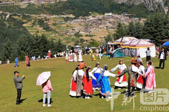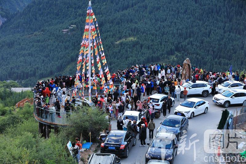 8月19日,游客在扎尕那景區(qū)仙女灘游玩。扎尕那景區(qū)位于甘肅省甘南藏族自治州迭部縣益哇鎮(zhèn),藏語(yǔ)意為“石匣子”,整個(gè)景區(qū)平均海拔在3000米以上,四周群山環(huán)抱,山頂云霧繚繞,森林、草原、青稞梯田與獨(dú)特的人文景觀互補(bǔ)整合,藏式民居點(diǎn)綴其間,吸引游客前來(lái)參觀游玩。中新社發(fā) 陳永剛 攝