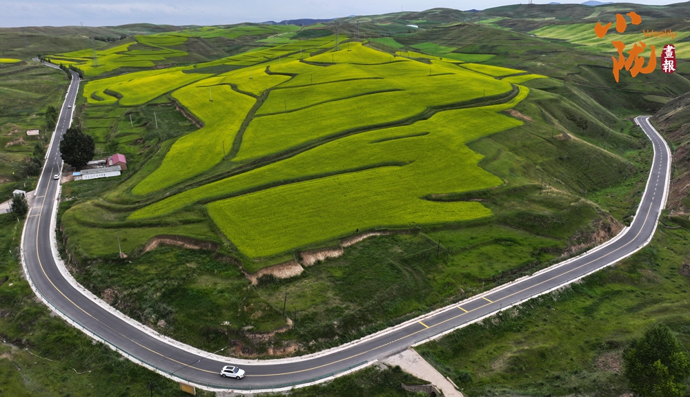 黃燦燦的油菜花鋪蓋在逶迤的山坡上,染盡山野,與此起彼伏的祁連山脈、古樸的民舍、一望無(wú)際的田野,共同繪就了一幅極具藝術(shù)感的“油畫”。