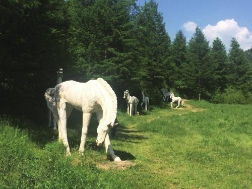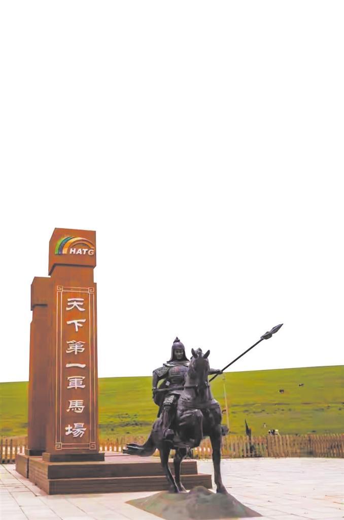 在碧草連天的谷地,當(dāng)?shù)芈糜尾块T擺放了一組白馬的大型雕塑,栩栩如生,它們要么仰天長嘶,要么低首撫弄地上的青草,還有的彼此耳鬢廝磨,像是親密的戀人。