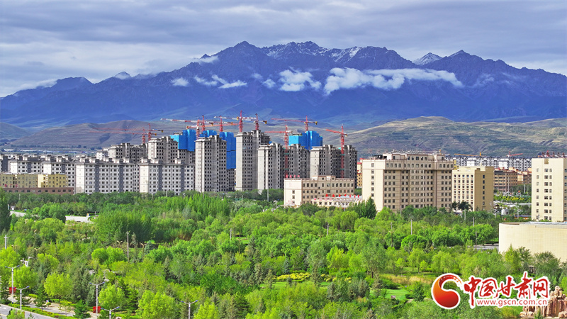 9月5日,雨過天晴的張掖民樂縣,城市清新如洗、生機(jī)盎然。云霧繚繞的山巒與高樓、民居、綠植相映成趣,繪出一幅如詩如畫的生態(tài)圖景。