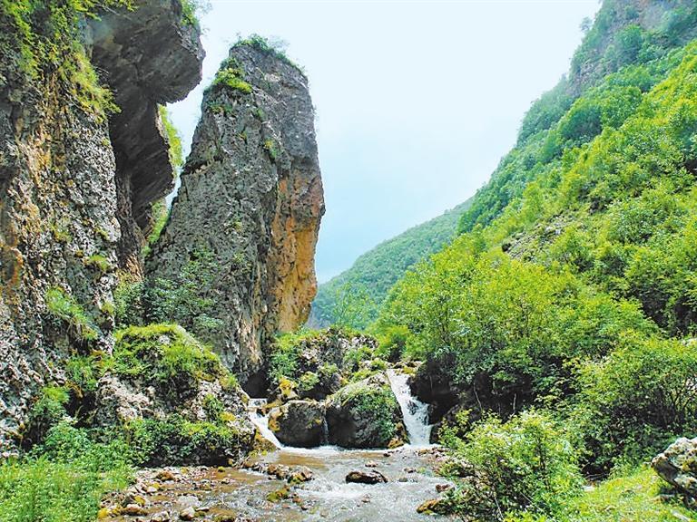 我們一行人驅(qū)車至雙石門峽谷口時,一群牦牛正在溝口悠閑地吃著草,就像一顆顆黑珍珠鑲嵌在綠色的絨毯上。雖是正午時分,撲面而來的風(fēng)兒,送來了高海拔特有的涼爽。進溝口沒走多久,便是第一道石門,兩座山石相對而立,石門的寬度可以供一輛小車通行,但滿地的碎石,尖銳而突兀,一般情況下,人們開車行至這里,只能“棄車”于石門外,徒步進入。