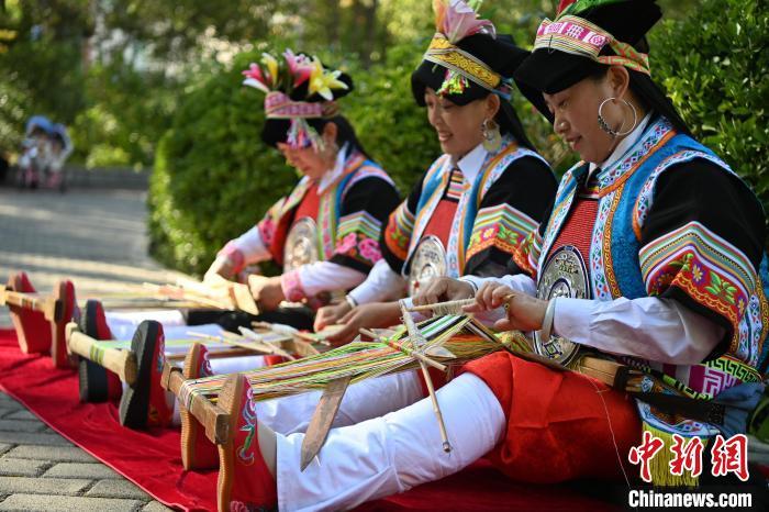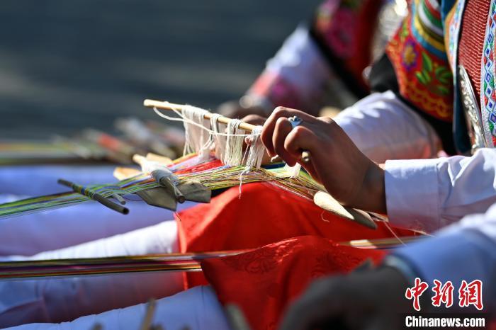 9月26日,甘肅省甘南藏族自治州舟曲縣,當(dāng)?shù)夭刈鍕D女紡織錦帶吸引游人駐足觀賞。錦帶是舟曲藏族婦女用以束腰、扎靴、攏發(fā)乃至點綴服飾的花帶子,艷麗多彩、圖案優(yōu)美。每逢吉慶節(jié)日,藏族婦女穿戴的華麗盛裝就需要少則五、六條,多則十幾條寬窄長短相宜的錦帶來裝飾。據(jù)介紹,藏族織錦帶技藝歷史悠久,一千多年以前,古羌族和吐蕃已有了較發(fā)達的手工編織技術(shù),在艱難的生活條件下對服飾等生活用品除實用功能之外,已經(jīng)有了強烈的審美追求,是研究舟曲羌藏文化的“活化石”。中新社記者 九美旦增 攝