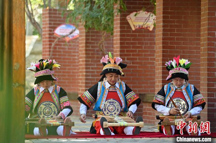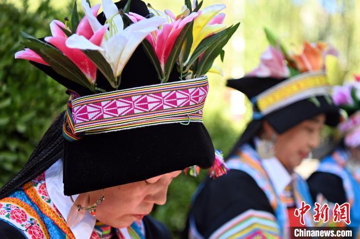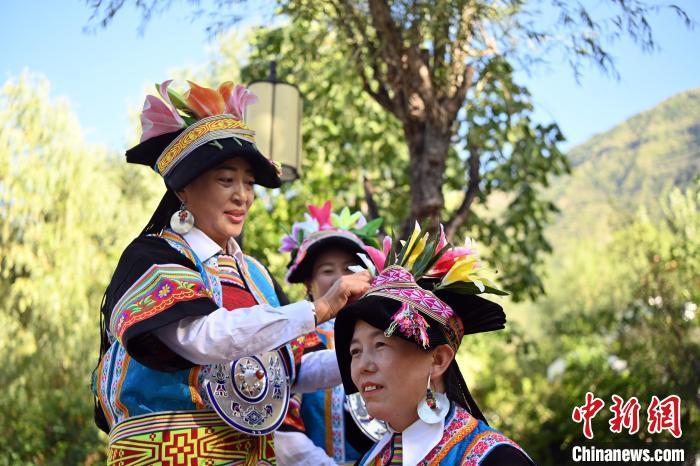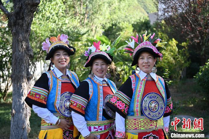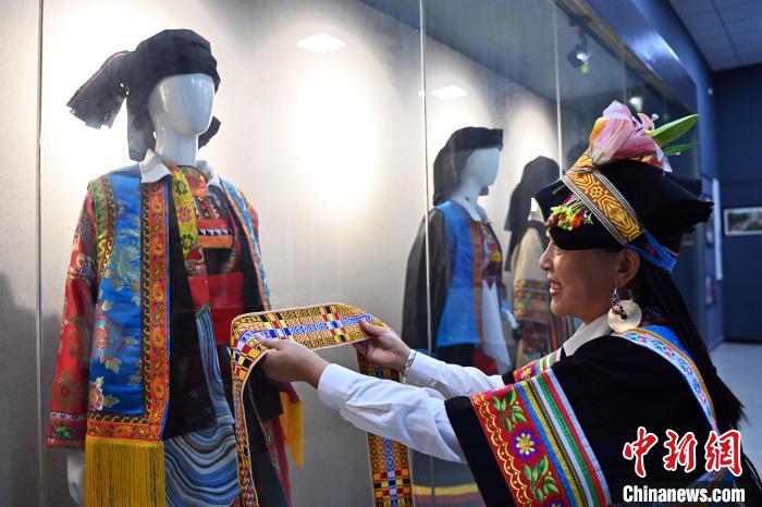 9月26日,甘肅省甘南藏族自治州舟曲縣,當(dāng)?shù)夭刈鍕D女展示錦帶佩戴方式。錦帶是舟曲藏族婦女用以束腰、扎靴、攏發(fā)乃至點綴服飾的花帶子,艷麗多彩、圖案優(yōu)美。每逢吉慶節(jié)日,藏族婦女穿戴的華麗盛裝就需要少則五、六條,多則十幾條寬窄長短相宜的錦帶來裝飾。據(jù)介紹,藏族織錦帶技藝歷史悠久,一千多年以前,古羌族和吐蕃已有了較發(fā)達的手工編織技術(shù),在艱難的生活條件下對服飾等生活用品除實用功能之外,已經(jīng)有了強烈的審美追求,是研究舟曲羌藏文化的“活化石”。中新社記者 九美旦增 攝
