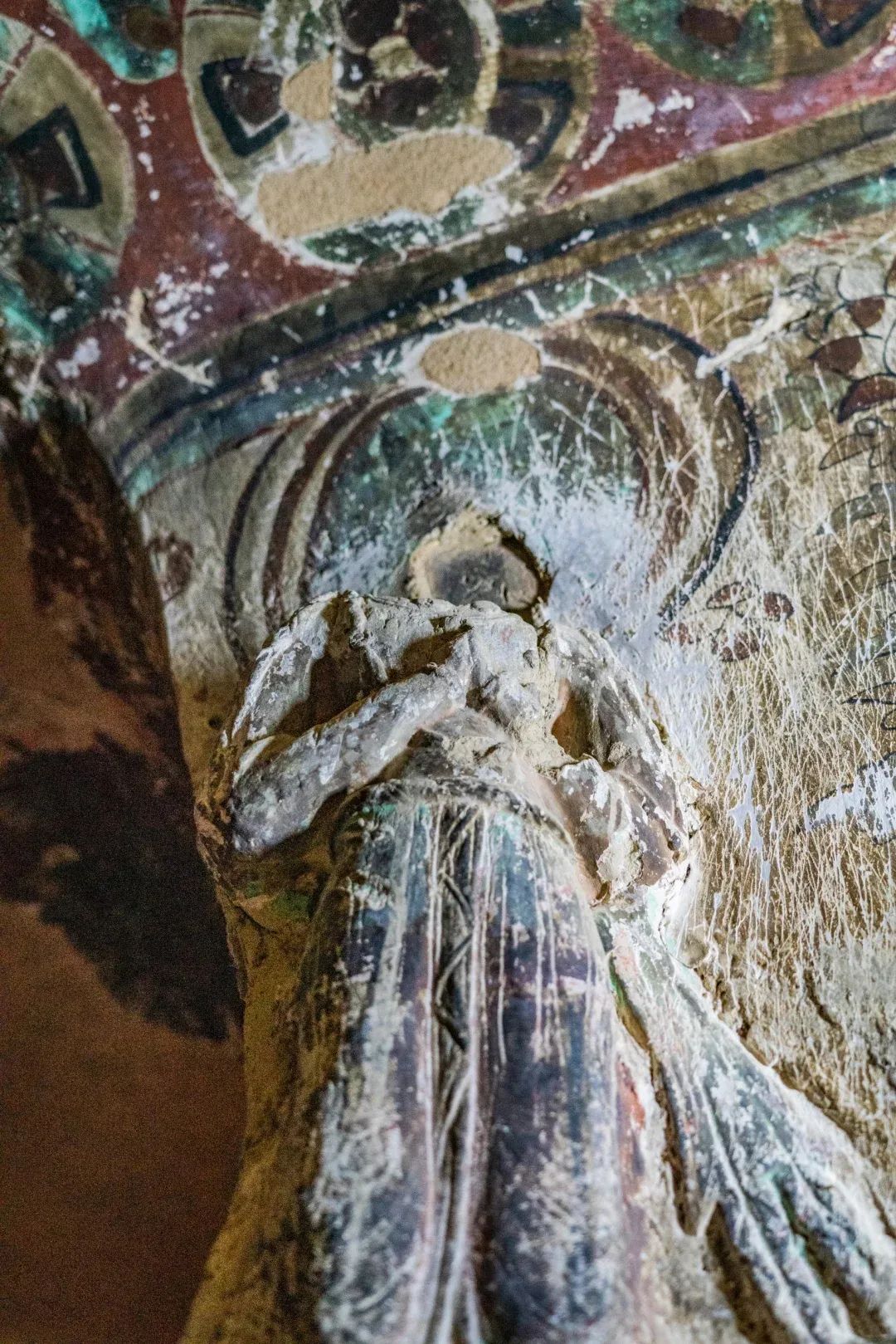 昌馬石窟所在的玉門地區(qū)是古代絲綢之路的必經(jīng)之地,也是佛教東傳的必經(jīng)之地。早期從印度或西域傳來的佛教造像風(fēng)格在昌馬石窟中也有所反映。第4窟中心柱上層的坐佛塑像采用的在胸前及手臂表面呈連續(xù)相疊的“U”字形下垂的陰線刻衣紋的形式,我們在敦煌莫高窟第259窟與馬蹄寺石窟千佛洞第2窟等處的坐佛塑像身上都可以見到,這種貼體的袈裟表面陰刻規(guī)整衣紋的形式是受到印度笈多造像藝術(shù)影響的產(chǎn)物。