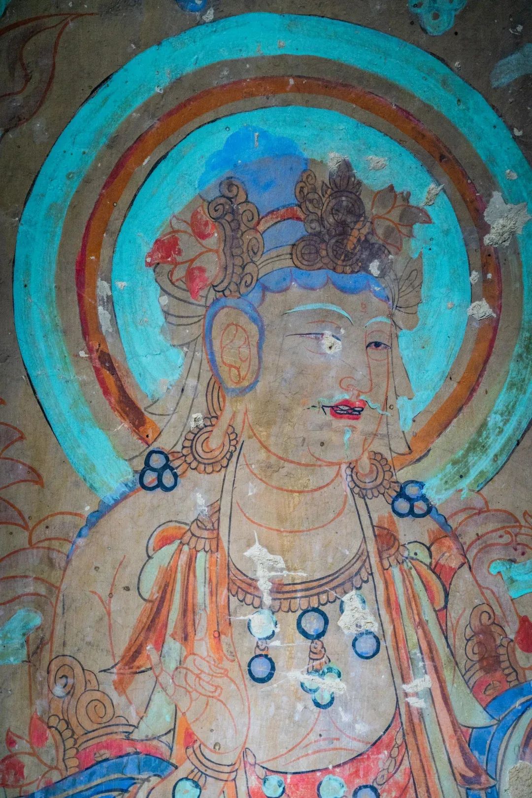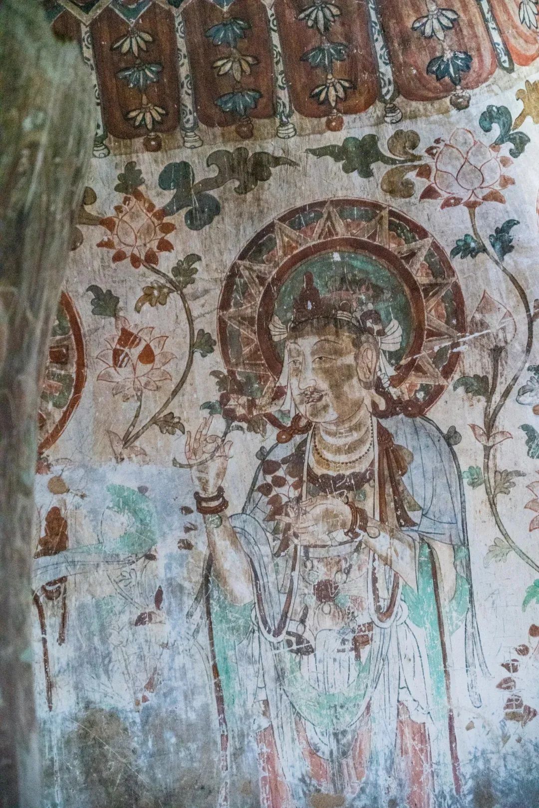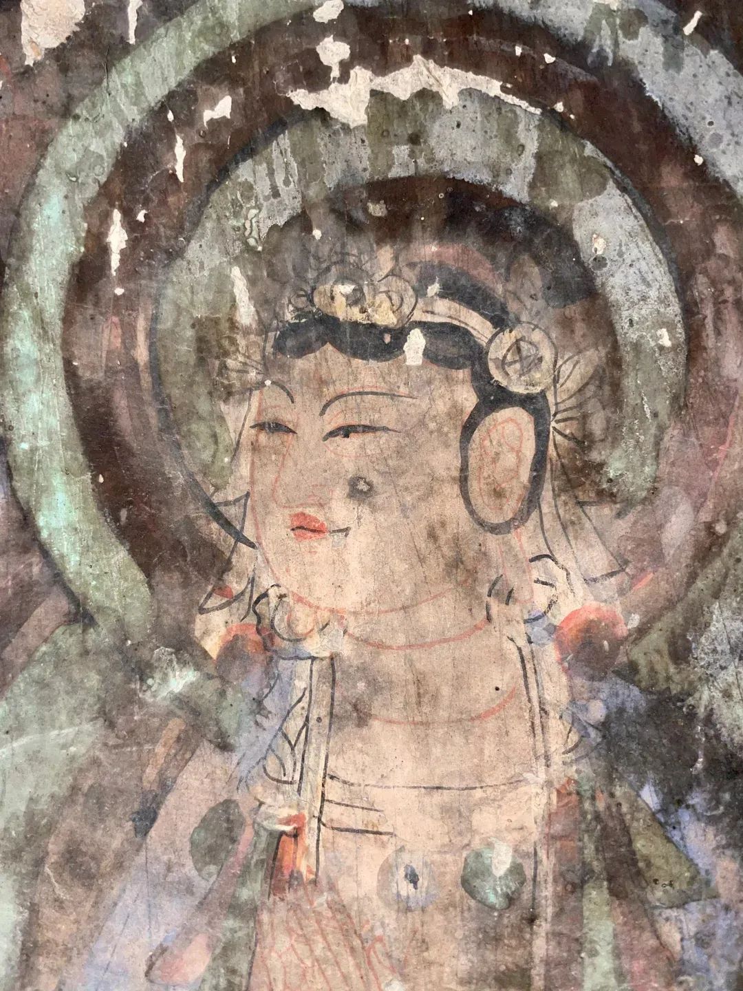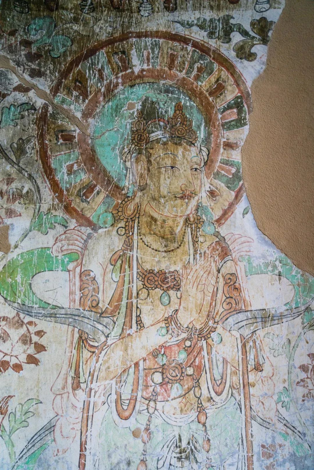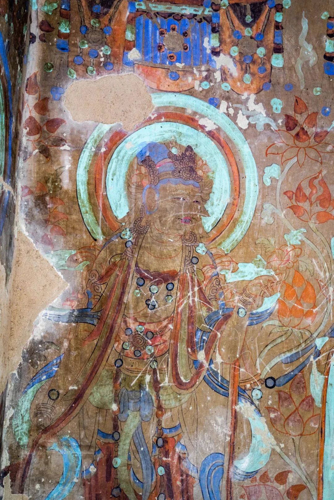 現(xiàn)在第4窟中早期塑像多數(shù)已毀,但仍殘存少數(shù)幾身,十分珍貴;各側(cè)面表層為西夏重修時繪制的壁畫;柱座與柱身的兩層自下而上逐層縮??;中心柱正面在西夏時改造成一橢圓形的大背屏,背屏正面表層為清代重繪的壁畫;四壁及頂上壁畫也多為西夏時期。