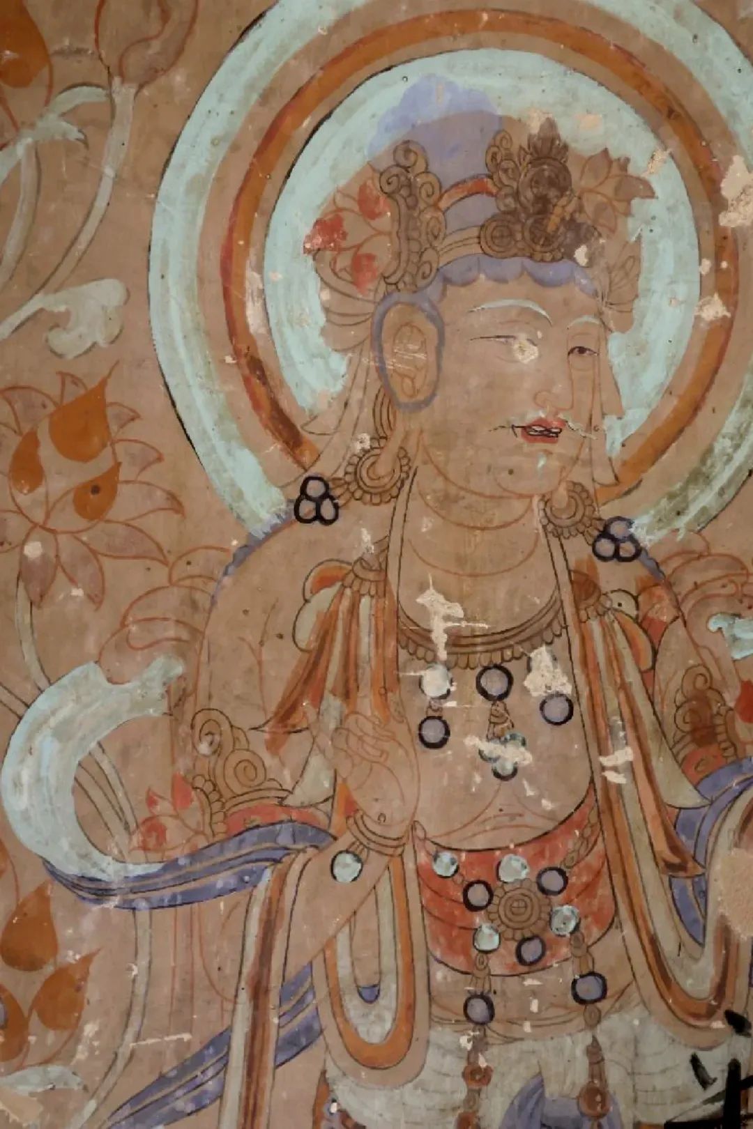 昌馬石窟第1、2、4窟表層西夏時期所繪壁畫的內(nèi)容,用色及菩薩的服裝等極接近敦煌莫高窟第328、327窟和榆林窟第17窟西夏壁畫。其用筆比較端莊拘謹(jǐn),不似唐代自由流暢;用色以赭紅、大綠為主;人物造像尤其是菩薩形象程式化,菩薩衣飾華麗復(fù)雜,但神態(tài)略顯呆板,不似唐代優(yōu)美生動和神采煥發(fā);裝飾圖案繁縟化,這些都與敦煌莫高窟、瓜州榆林窟、肅北五個廟同時期的壁畫具有統(tǒng)一的時代風(fēng)格。