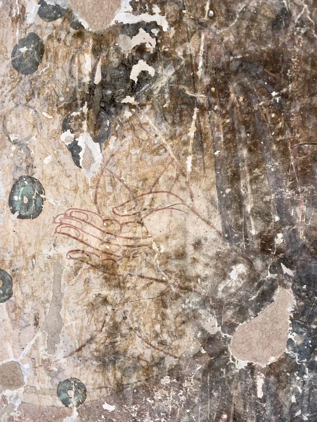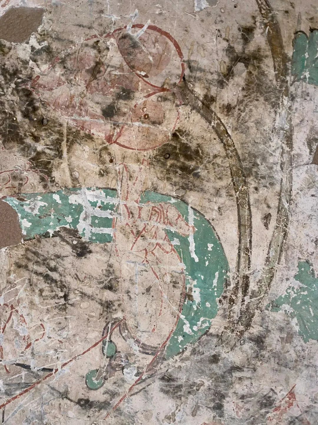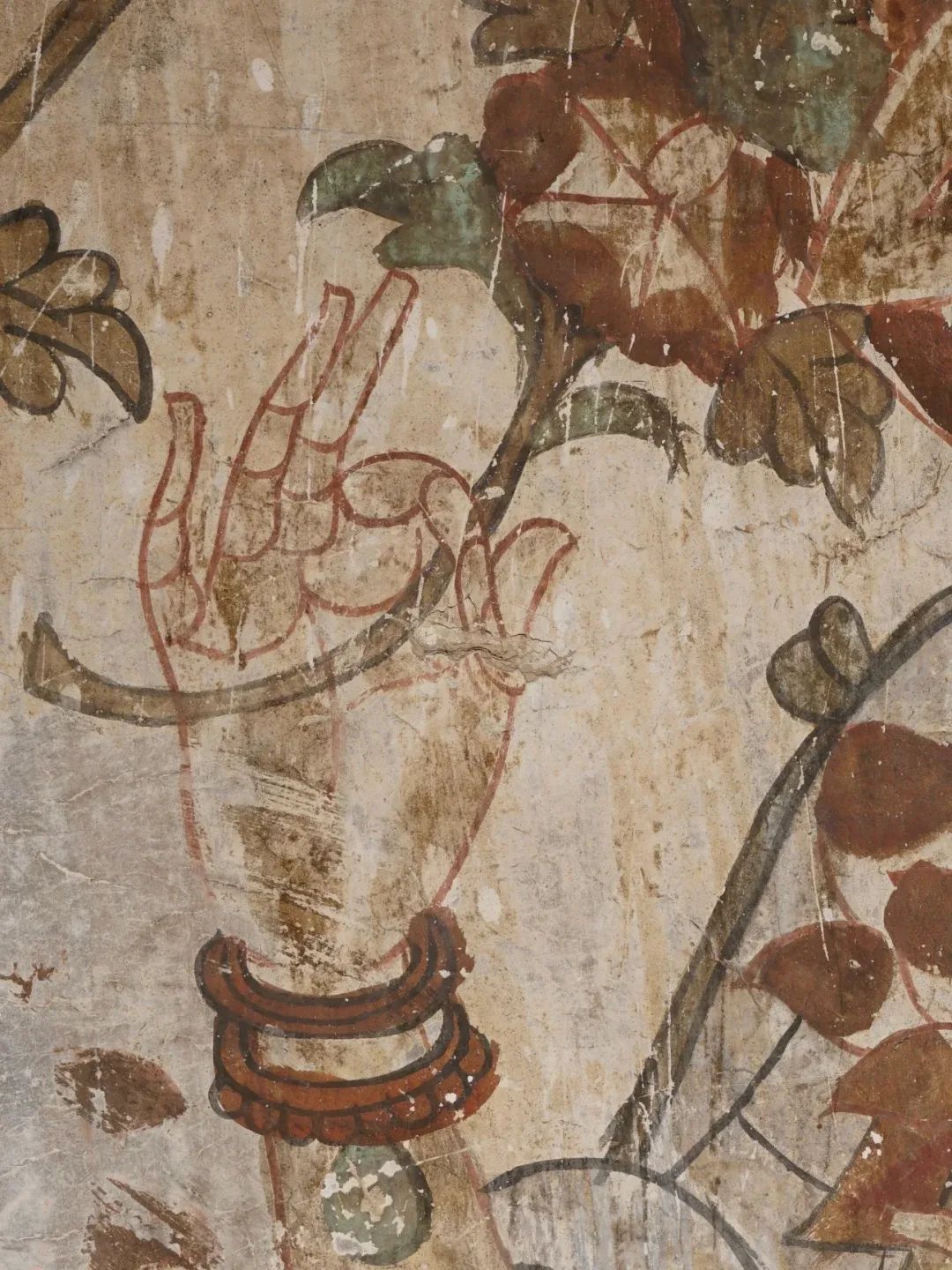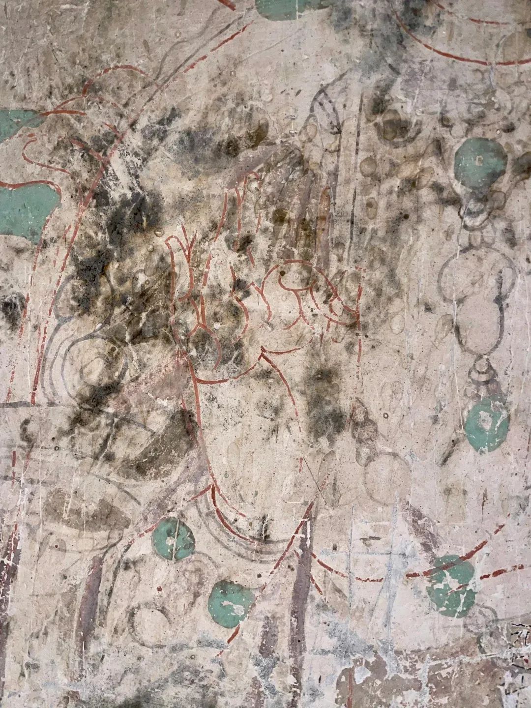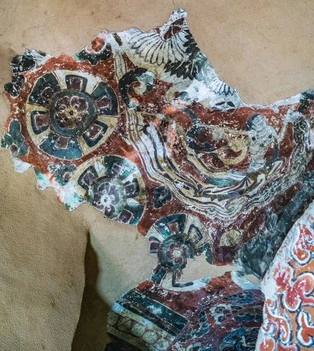 昌馬石窟第4窟洞窟形制及其殘存的塑像對于研究中國早期石窟藝術(shù)與佛教造像藝術(shù)極其重要。窟內(nèi)壁畫內(nèi)容是四壁上方畫條式旌幡,下畫供養(yǎng)菩薩,身高近2米,今殘存20身,菩薩周圍畫纏枝蓮,與第二窟基本相同。窟頂前半部地仗大部分脫落,靠近中心柱正面上部右側(cè)的部位殘存龜形六瓣團花圖案與一身飛天及菊花紋圖案。后部中心柱頂部周圍窟頂表面繪龜形六瓣團花、連珠紋等圖案。