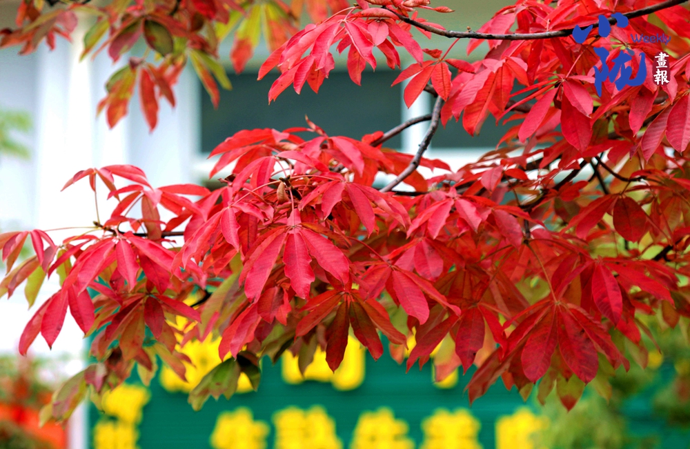 淡淡的秋霜將樹葉染成綺麗多彩的鮮紅和金黃,與綠葉共舞,層層疊疊,在凋零中展現(xiàn)生命的堅韌。