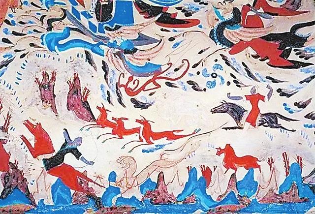 在莫高窟第249窟壁畫中有一幅“行獵圖”:畫面上都是些體型巨大的動物,有體態(tài)矯健的猛虎、疾馳俊逸的鹿群、整裝待發(fā)的獅子等,有在奔馳的駿馬上拈弓搭箭窮追不舍的獵人,還有在飛奔的駿馬上淡定轉(zhuǎn)身從容射虎的獵人。整個畫面既緊張又美好,使人不由得對畫師精湛的技藝心悅誠服。唐代詩人王維在詩作《觀獵》中寫道:“風勁角弓鳴,將軍獵渭城。草枯鷹眼疾,雪盡馬蹄輕。忽過新豐市,還歸細柳營?;乜瓷涞裉?,千里暮云平。”意思是說將軍的獵騎,飛馳在渭城的近郊。風中傳來呼嘯的弦聲。已枯的野草,擋不住尖銳敏捷的鷹眼,積雪后飛馳的駿馬馬蹄會愈加輕盈。據(jù)文獻記載,唐宋時期人們打獵時多有一種“西北望,射天狼”的豪情!在莫高窟第85窟壁畫中還有一幅“行獵圖”就形象地反映了唐人狩獵的情景:畫面上的四個健碩獵人正在整裝出獵,他們著裝統(tǒng)一:頭戴幞頭,身穿缺胯衫,足蹬半腰靴。打獵的裝備也很不同:有人胳臂上架鷹、有人單手牽犬、有人持弓挎箭囊,甚至還有一人手持利斧。