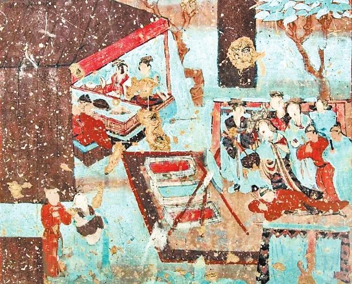 古人會在一年的歲末舉行一次集體聚會,稱作“建福”。在敦煌文獻《社司轉(zhuǎn)帖》中寫道:“右緣常年建福一日,人各爐餅壹雙,凈粟壹斗。幸請諸公等,帖至限今月廿二日卯時于安家酒店取齊。”意思是說,只要有可能,每年到了年末大家都要選擇一日來進行建福。每家每戶需要按時把準備建福的物資送過來。唐朝詩人李白在《客中行》一詩中寫道:“蘭陵美酒郁金香,玉碗盛來琥珀光。但使主人能醉客,不知何處是他鄉(xiāng)。”意思是說蘭陵美酒甘醇甜美,就像郁金香一樣芬芳四溢。興來盛滿玉碗,泛出琥珀光晶瑩迷人。主人端出如此好酒,定能醉倒他鄉(xiāng)之客。飲酒之后哪能分清故鄉(xiāng)與他鄉(xiāng)呢?歲暮聚飲蘊含有辭舊迎新、攘兇納吉的美好愿望。在莫高窟第12窟壁畫中有一幅“帳篷酒肆圖”:畫面中圍坐在條形長桌兩邊正盡興暢飲的客人為七人,還有兩個熱情忙碌的服務人員。整個畫面是一幅酒酣耳熱、興致高昂的歡飲圖。更為氣勢恢宏、熱鬧非凡的是莫高窟第23窟壁畫中一幅“院落圖”:畫面中分院落之內(nèi)與院落之外兩個部分,院落之內(nèi)是世俗的世界,畫面上布局著鱗次櫛比的廳堂房屋,有人正在庖廚、有人正在對弈、有人正在暢聊、有人正在團聚,也有人正在說教,總之表現(xiàn)的是我們?nèi)粘I畹陌賾B(tài)。院落之外是佛國世界,整體呈現(xiàn)出肅穆莊嚴之感。有趣的是在佛國與世俗世界中間,畫的是服飾艷麗,騎馬遠行的人們。