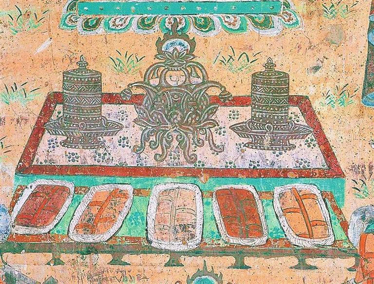 宋朝詩人陸游在《食粥》一詩中寫道:“世人個個學長年,不悟長年在目前。我得宛丘平易法,只將食粥致神仙。”意思是說人人都期盼長壽,怎么也沒有想到,我就成了長壽之人。如果讓我總結(jié)一下我長壽的秘訣,那就是我喝的粥多而已。想想冬天到了,天寒地凍,喝碗粥,渾身上下暖烘烘的多美啊。可是在敦煌壁畫里,人們在冬季不是喝粥,而是喝熱牛奶。在莫高窟第146窟壁畫中有一幅“擠牛奶圖”:畫面上一頭健碩的母牛正在被人擠奶,它回首望向擠奶者。在它的身下,還有一只小牛犢正貪婪地望著擠奶者。兩頭牛都憨態(tài)可掬、萌蠢可愛。漫天飛雪中,煮沸的牛奶溫暖著漫長冬季的每時每刻。在莫高窟第302窟中有一幅“湯水浴圖”。湯水就是溫泉。畫面上在樹木掩映之下有一池溫泉,有一大一小兩個人正沉浸在溫泉沐浴的歡快之中。可見,伴著紛飛的大雪泡個溫泉,不是只有今天才有的享受;在千年之前的敦煌,人們就已經(jīng)開始修建溫室浴池,而且引水排水的技術(shù)已經(jīng)較為完善。院落依依、親朋融融、池水湯湯、筋骨軟軟,逸興悠悠。