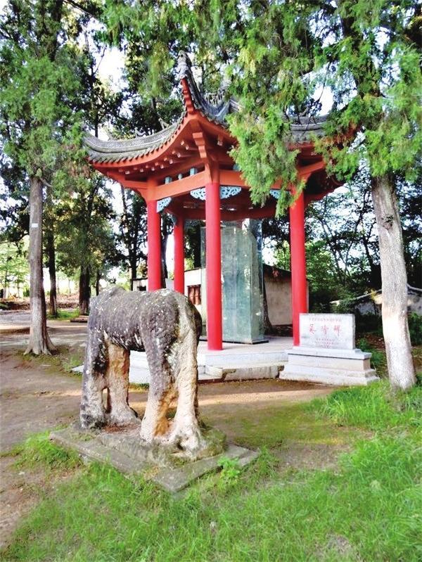到達(dá)山頂?shù)膮谦d墓,眼前出現(xiàn)的是兩尊相向而立高大的宋代石人,石人的不遠(yuǎn)處是一對(duì)相互對(duì)望的石馬。在這兩匹宋代高大石馬的后面,是一個(gè)由六根朱紅色木柱擎起的六角亭。亭子里一塊石碑矗立其間,碑上刻著 “宋故開府吳公墓志銘”。