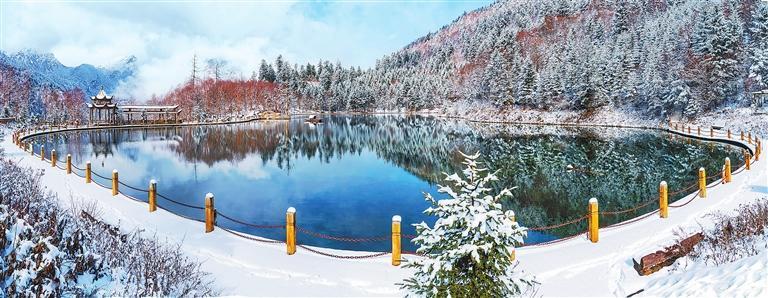 眺望遠(yuǎn)方,潔白的冰雪與擂鼓山遙相輝映,雪花盡飛處,仿佛細(xì)碎的春天早已鋪滿了原野。燕子湖的豐盈昭示著來年的風(fēng)調(diào)雨順,羊頭圖騰穿越千年的風(fēng)景,搖曳著鳳凰騰飛的美夢(mèng)。一個(gè)個(gè)湖畔,色彩暖暖的羌式小屋,靜靜地享受著冬日的安寧與愜意。