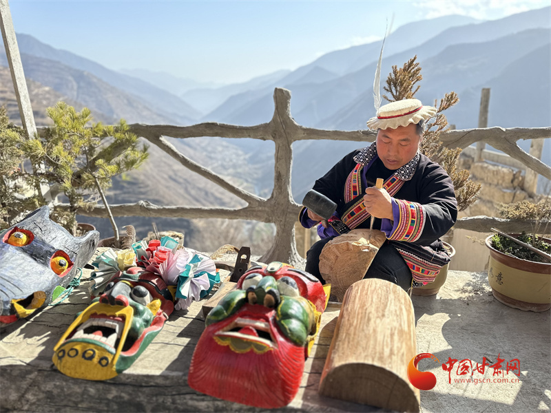 甘肅隴南市文縣鐵樓藏族鄉(xiāng)強曲村,白馬群眾薛剛一家四代人都精于木工。薛剛坐在自家院子里,伏案制作池哥晝所用面具。池哥晝是白馬人保留最完整、最具特色民族舞蹈,面具是重要道具之一。