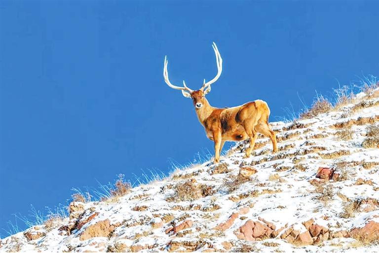 雪豹皮毛呈灰白色,有黑色點斑和黑環(huán),在巖石堆中是極好的保護色。雪豹行蹤神秘,以往人們只有通過雪地上的梅花掌印確定它的足跡。近年來,隨著祁連山生態(tài)環(huán)境的持續(xù)好轉(zhuǎn),保護區(qū)已經(jīng)成為雪豹、白唇鹿等珍稀動物繁衍生息的樂土。作為高原生態(tài)食物鏈頂端的食肉動物,雪豹對維持祁連山生態(tài)系統(tǒng)的穩(wěn)定與健康至關重要。