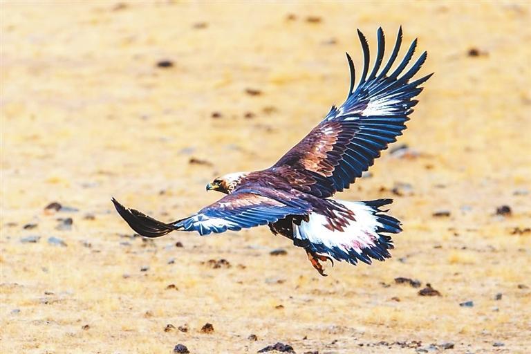 金雕以其卓越的捕獵技巧和優(yōu)雅的飛行姿態(tài)而聞名,主要棲息于高山草原、森林及河谷地帶。在祁連山遼闊的草原之上,金雕展開它那寬闊且有力的雙翅,在藍天之中肆意翱翔。陽光傾灑下來,深褐色的羽毛閃爍著如同金屬般耀眼的光澤,猶如披上了一件堅不可摧的鎧甲,威風凜凜。它那犀利的眼神,仿佛能夠穿透重重迷霧,洞察這片廣袤土地上的每一個細微變化,盡顯王者風范。它身姿雄偉而威嚴,宛如一位至高無上的王者,向整個世界展示著它那不容小覷的力量與威嚴,默默地守護著這片廣袤無垠的草原天地。