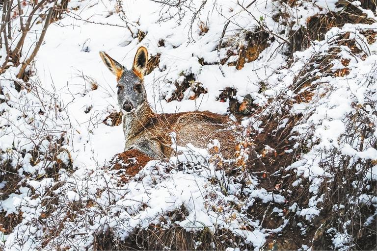 攝影師鏡頭下,一只馬麝安然臥在雪地上,它的耳朵偶爾會輕輕抖動一下,像是在用心傾聽著風中傳來的細微聲響。它優(yōu)美的身形與周圍的景色完美融合在一起,寧靜而祥和。
