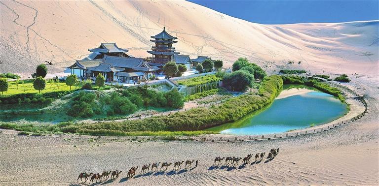 鳴沙山以沙山稱奇,多變的沙丘是其更具魅力的體現。在風的不斷作用下,使得鳴沙山保持其特有的高度和形式。也正是因為風的作用,不同的物質在鳴沙山聚集,形成了特有的黑、綠、紅、黃、白五種顏色不同的沙子。而月牙泉就是被鳴沙山包圍,因沙泉相擁千年不涸而聞名于世,坐落在兩個古老沖積扇之間的月牙泉,由于地下水不斷流出松散沉積層形成泉,逐漸演化成世界地質遺跡奇觀。