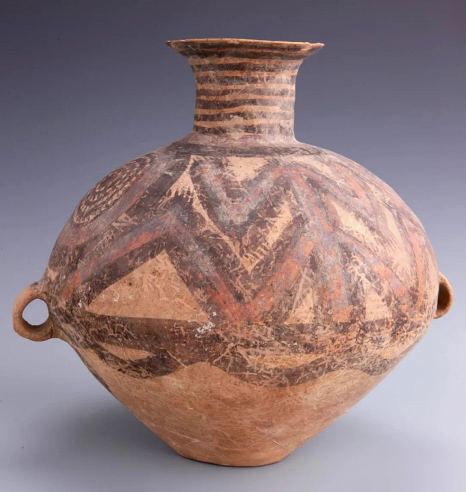 彩陶蛙紋壺,新石器時代馬家窯文化馬廠類型,高42厘米,口徑13.1厘米。壺泥質(zhì)紅陶,口外侈,薄唇,球形腹,小平底,腹部兩側(cè)對稱置雙系。于橙紅色陶衣上以黑彩描繪變形蛙紋。圖案線條流暢,富于變化,與造型協(xié)調(diào)一致。據(jù)科學(xué)測試,馬家窯文化馬廠類型彩陶的年代約為公元前2200~前2000年。變形蛙紋作為馬家窯文化馬廠類型彩陶上常見的裝飾紋樣之一,體現(xiàn)了遠(yuǎn)古人們對于繁衍生殖的渴望。青蛙產(chǎn)下許多卵,孵出許多蝌蚪,正是繁衍旺盛的象征。