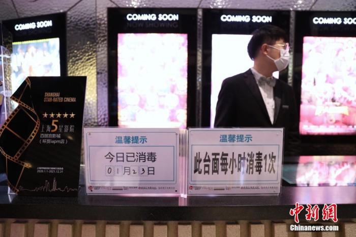 資料圖:1月23日,在上海影城、百麗宮等熱門影院前來購票觀影的人數(shù)寥寥。圖為影院在醒目位置豎起“已消毒”標牌。中新社記者 張亨偉 攝
