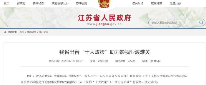 2月19日,江蘇省八部門聯(lián)合發(fā)布《關(guān)于支持全省電影業(yè)應(yīng)對新冠肺炎疫情影響促進(jìn)平穩(wěn)健康發(fā)展的政策措施》,即“影十條”,從落實(shí)稅收優(yōu)惠政策、加強(qiáng)財政支持力度、加大信貸投放、減免房租等十方面幫助電影業(yè)。