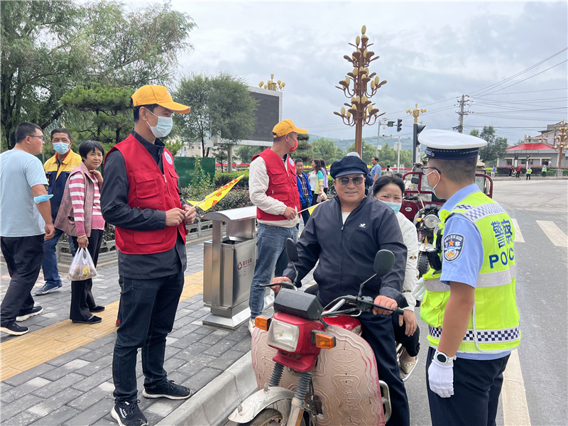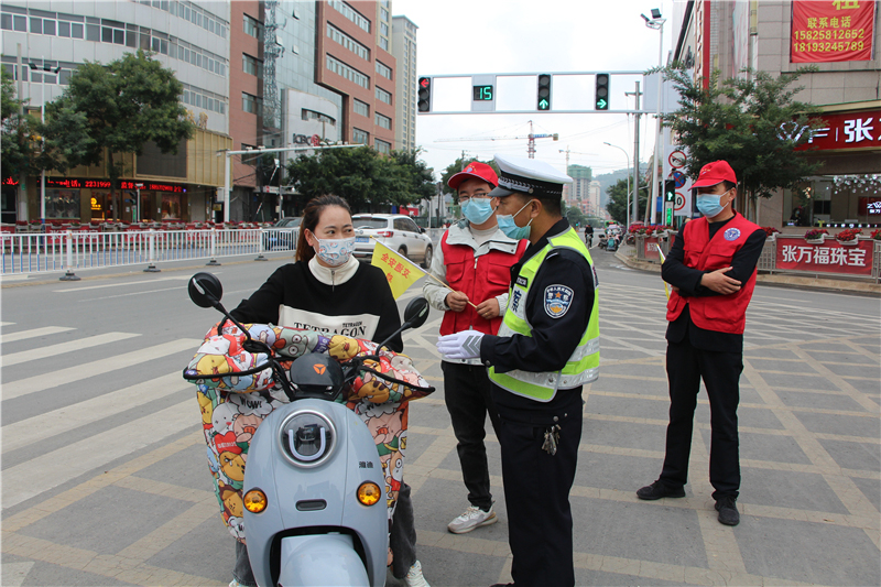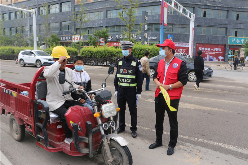 9月28日上午,參加“駕駛?cè)藢W(xué)習(xí)教育體驗”活動的記滿分駕駛?cè)苏诟拭C定西岷縣小南門十字路口對不文明交通行為認(rèn)真的進行著勸導(dǎo)。