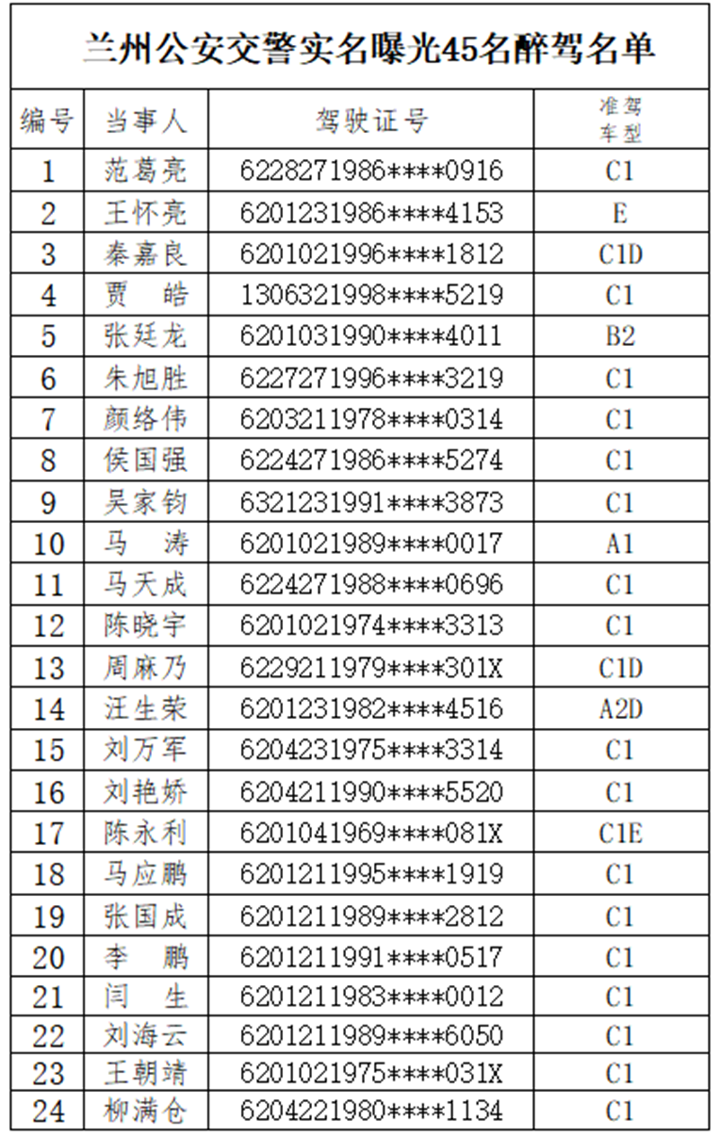 今年以來,蘭州市共查處酒醉駕1249起。其中,飲酒駕駛721起,醉酒駕駛528起。6月以來,又查處酒醉駕案件50起。然而,還是有人心存僥幸,甚至酒醉駕駕車引發(fā)道路交通事故。為進(jìn)一步加強(qiáng)交通安全宣傳和警示教育,強(qiáng)化社會(huì)監(jiān)督,蘭州公安將近期查獲的45名醉酒駕駛機(jī)動(dòng)車人員予以曝光,名單如下: