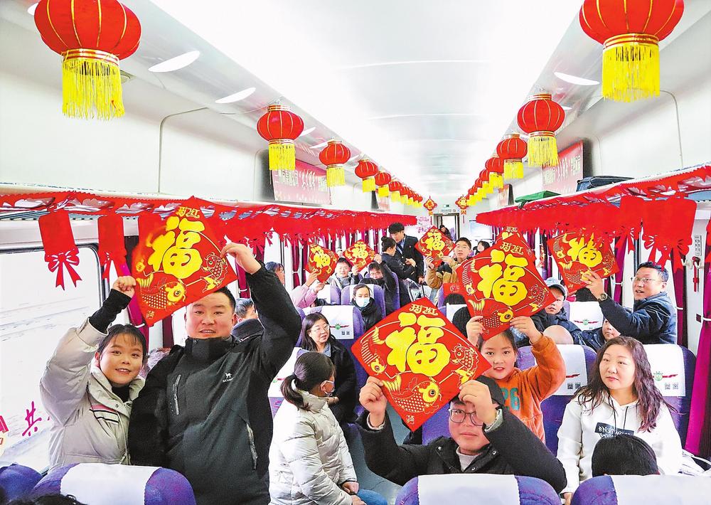 7504次“富民號”列車上張燈結(jié)彩,歡聲笑語。新春佳節(jié)來臨之際,無數(shù)人心懷著對家鄉(xiāng)的眷戀,踏上溫馨的回家之路。 新甘肅·甘肅日報記者丁凱攝