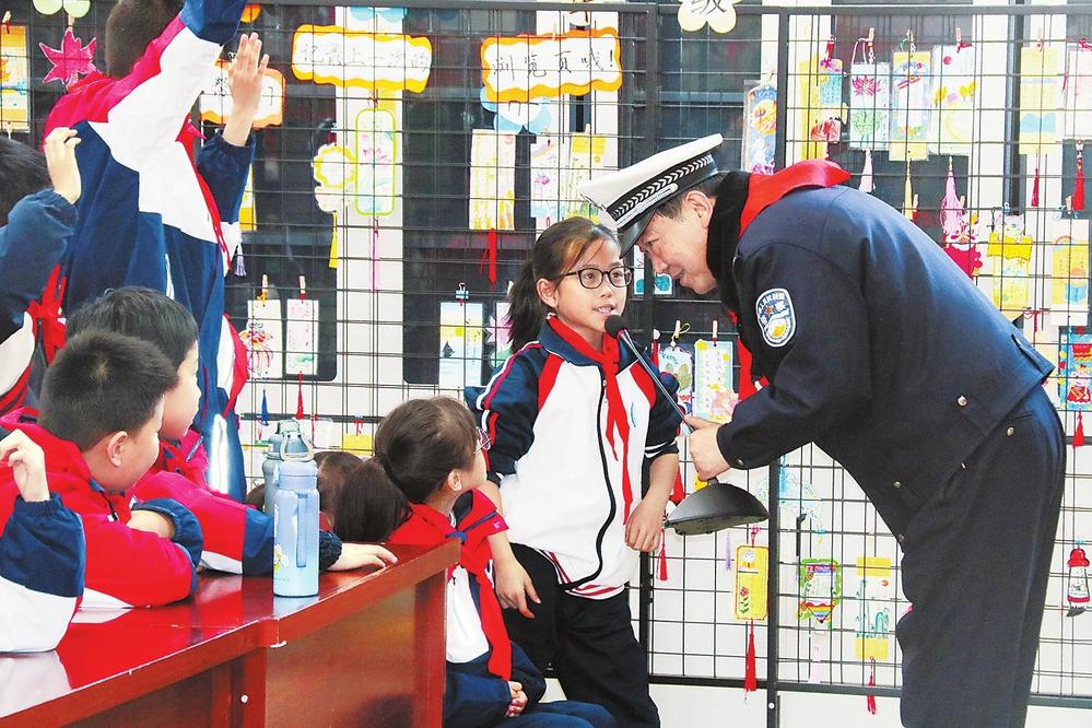 民警與同學(xué)生互動交流。2月26日,蘭州市公安局交警支隊紅古大隊民警走進學(xué)校,開展“小手牽大手”交通安全宣傳活動。新甘肅·甘肅法治報記者王輝攝