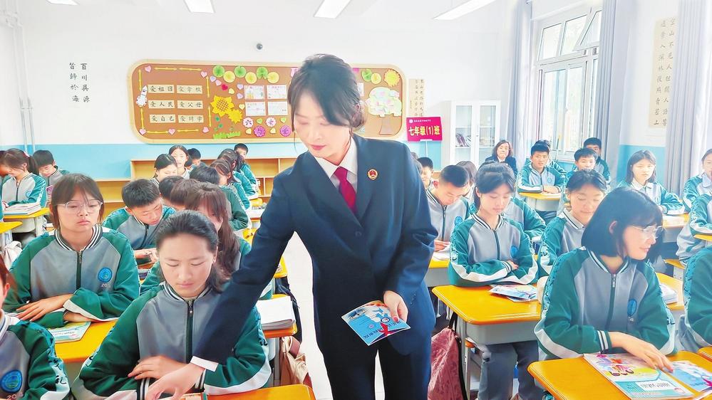 檢察干警走進校園向?qū)W生發(fā)放宣傳資料。