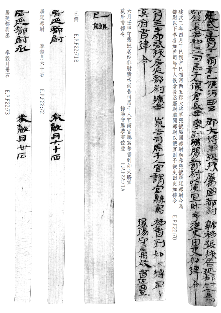 1974年8月出土于甲渠候官遺址第22號(hào)房址內(nèi)。簡(jiǎn)冊(cè)由10枚簡(jiǎn)組成,每簡(jiǎn)長22.8厘米,前兩簡(jiǎn)寬2.5厘米,其余8簡(jiǎn)寬1.4厘米。全文200字。內(nèi)容為東漢建武三年(公元25年)竇融統(tǒng)治河西期間留下的一份完整的財(cái)政文書。簡(jiǎn)文是關(guān)于居延都尉府吏員奉谷標(biāo)準(zhǔn)的通知,由領(lǐng)河西五郡大將軍張掖屬國都尉竇融幕府下發(fā),簡(jiǎn)言“如律令”可知其指令具有法律效力。