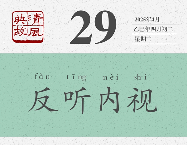 后人將“反聽之謂聰,內(nèi)視之謂明”縮減為“反聽內(nèi)視”四個字,并以此為典提醒人們,對外要虛心聽取別人的批評意見,對內(nèi)要及時反省自己的所作所為?!逗鬂h書·王允傳》:“夫內(nèi)視反聽,則忠臣竭誠;寬賢矜能,則義士厲節(jié)。”