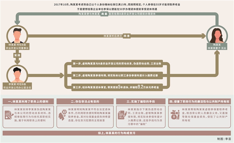 貪污罪。2017年10月,林某某妻子陶某某(無業(yè),另案處理)考慮到自己以個(gè)人身份繳納社保已滿15年,而按照規(guī)定,個(gè)人參保在55歲才能領(lǐng)取養(yǎng)老金,于是便想掛靠企業(yè)單位參保,以便能在50歲辦理退休、提前享受退休待遇?;诖?,陶某某便與林某某商量能否掛靠B縣農(nóng)業(yè)開發(fā)公司提前辦理退休,林某某聽后表示同意,并利用擔(dān)任該公司董事長的職務(wù)便利,在明知陶某某不符合提前退休條件的情況下,安排時(shí)任公司辦公室主任李某某(另案處理)虛構(gòu)勞動(dòng)關(guān)系,為陶某某以該公司職工身份辦理退休事宜。手續(xù)辦理過程中,李某某按林某某的安排,偽造B縣農(nóng)業(yè)開發(fā)公司與陶某某的《勞動(dòng)合同書》,經(jīng)林某某本人簽字后加蓋公司合同專用章,陶某某憑該合同在B縣人力資源和社會保障局進(jìn)行勞動(dòng)合同鑒證。完成鑒證后,陶某某順利以B縣農(nóng)業(yè)開發(fā)公司職工身份參保,當(dāng)年度公司為其繳納職工養(yǎng)老保險(xiǎn)、工傷保險(xiǎn)、失業(yè)保險(xiǎn)、醫(yī)療保險(xiǎn)共計(jì)7649.76元。其間,陶某某從未在B縣農(nóng)業(yè)開發(fā)公司上班,也未向公司補(bǔ)繳為其繳納的社保費(fèi)用。