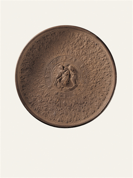 公元2-3世紀(jì),靖遠(yuǎn)縣征集,高4.6厘米,口徑31厘米,足徑10.9厘米。銀質(zhì)鎏金,以鑄造、錘鍱等工藝制成,鎏金已大部脫落。圓形,卷唇,斜孤壁,圈足。盤內(nèi)壁滿飾浮雕花紋,分3圈列置。外圈飾勾聯(lián)的葡萄卷草紋藤蔓,其間棲息30余只禽鳥等動(dòng)物。中圈外緣飾細(xì)小聯(lián)珠紋,內(nèi)周環(huán)列12個(gè)頭像,頭像間為禽鳥等動(dòng)物,或?yàn)橄ED神話中的奧林匹斯山12神。中心為一高浮雕裸體男性,卷發(fā)無須,身披長巾,右手持圖爾索斯杖,杖首為松果狀飾物,為希臘神話中的酒神狄俄尼索斯。酒神倚一花豹而坐,鼻梁凸出,側(cè)首張口,頸下帶花環(huán),身上遍布圓斑。盤底圈足內(nèi)有一行刻作虛點(diǎn)的銘文,銘文年代晚于做器年代。此件器物發(fā)現(xiàn)于絲綢之路甘肅段的黃河渡口,是研究中西交流重要的實(shí)物資料,也是十分罕見的絲綢之路遺珍。