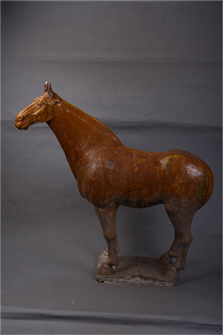唐代,秦安葉家堡出土,高90.5厘米,長(zhǎng)92厘米,寬27厘米。紅陶模制粘合而成,馬四足站立于方形踏板上,通體飾黃釉,塑造出膘肥體壯的駿馬造型。