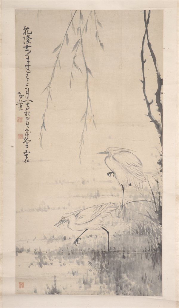 清代,水墨設(shè)色花鳥畫立軸,紙本,作者黃慎??v高1126厘米,橫寬57.4厘米??钍?ldquo;乾隆十一年春二月寫于蕪成堂寧化黃慎”。鈐“黃慎”白文方印,“癭瓢”白文方印。柳枝自畫面上方垂下,疏落的柳葉隨風(fēng)搖曳。池塘兩只白鷺,一只閉目獨(dú)立,一只行走覓食。黃慎,福建寧化人,書畫家,為“揚(yáng)州八怪”之一。