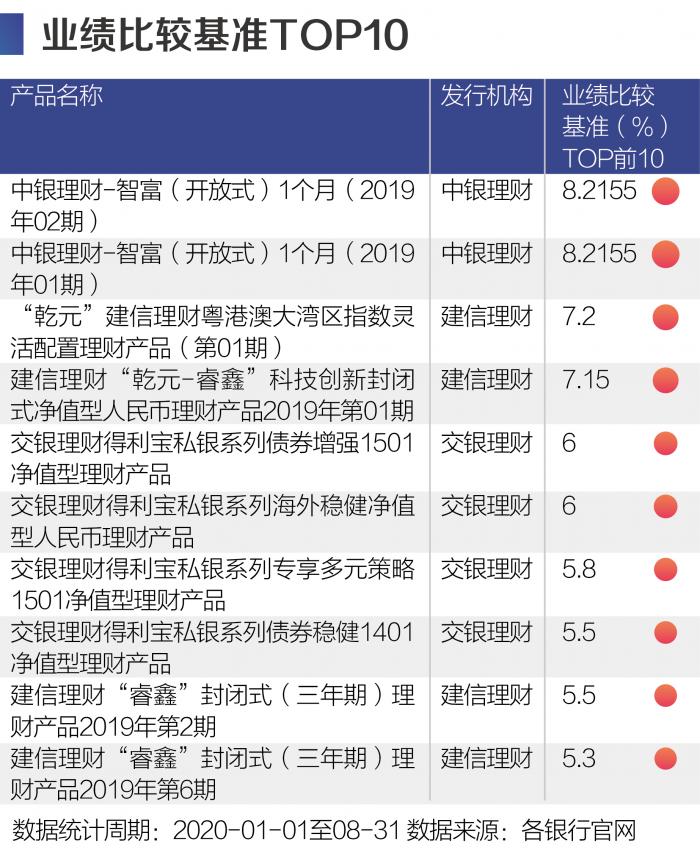 (注:對(duì)于少數(shù)非固定報(bào)價(jià)的產(chǎn)品,為了便于統(tǒng)一對(duì)比,課題組對(duì)數(shù)據(jù)進(jìn)行了量化處理,針對(duì)區(qū)間報(bào)價(jià)的業(yè)績(jī)比較基準(zhǔn)數(shù)據(jù)選取平均值,針對(duì)對(duì)標(biāo)其他指數(shù)收益的業(yè)績(jī)比較基準(zhǔn)折算為該產(chǎn)品成立日相關(guān)指數(shù)的收益率,并按照產(chǎn)品說明書中的計(jì)算方式折算成業(yè)績(jī)比較基準(zhǔn)。)
