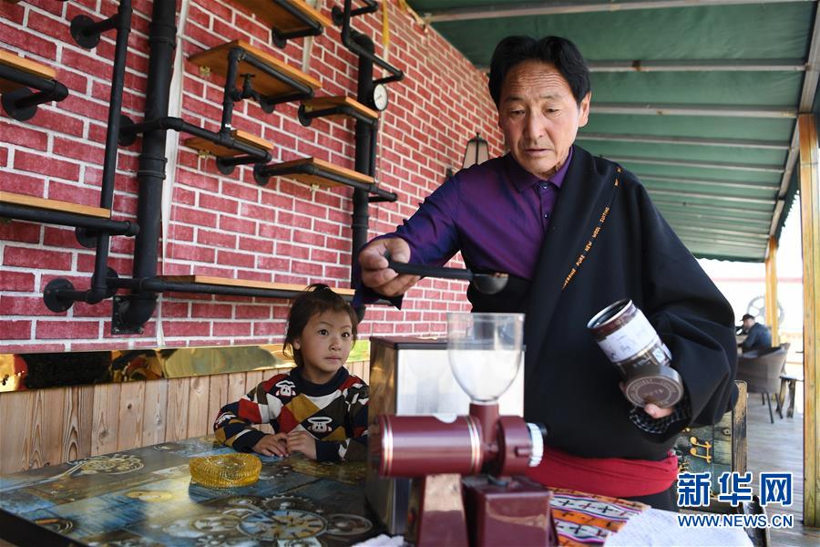 午后,草原上的天空一碧如洗,在海拔3300米的甘肅省甘南藏族自治州碌曲縣尕海鎮(zhèn)尕秀村,57歲的村民格日扎西正在自己的牧家樂里熟練地制作現(xiàn)磨咖啡,引來幾名游客用手機(jī)拍攝。