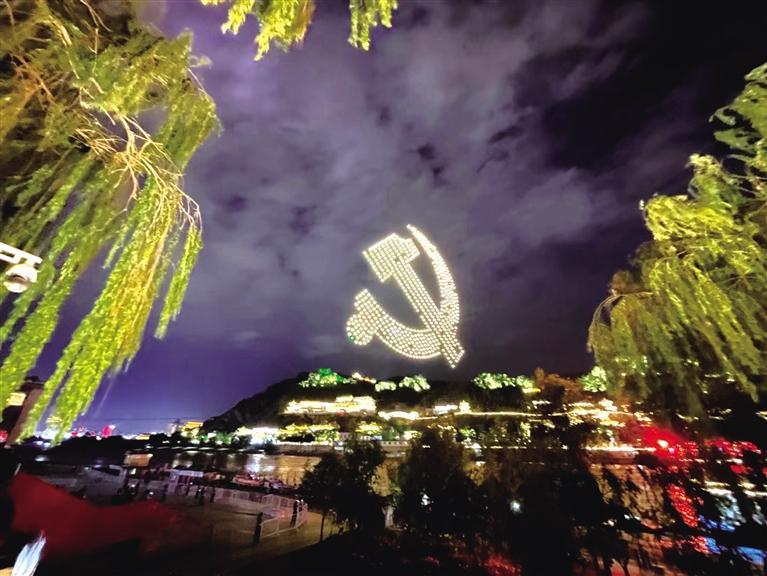 今夜的蘭州經(jīng)過雨水的沖洗格外清爽嫵媚,在現(xiàn)場,600架無人機(jī)翱翔天空,照亮璀璨的蘭州之夜,無人機(jī)在遙控下變換著各種隊形和字樣,表達(dá)對黨的生日祝福。
