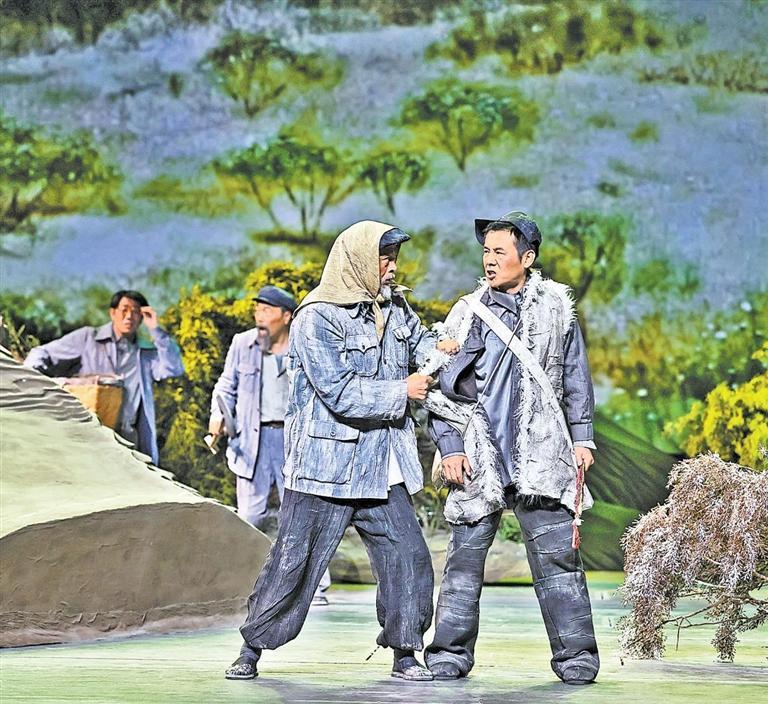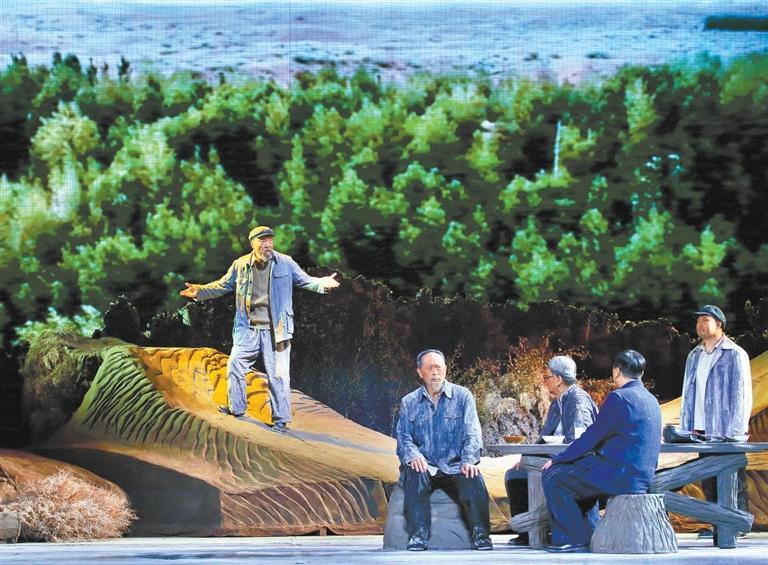 現(xiàn)實題材是話劇藝術的寵兒,在話劇進入中國一百多年的時光中,現(xiàn)實題材創(chuàng)作占據相當大的比例。在近當代中國歷史的進程中,話劇始終起著敢為天下先、針砭時弊的作用,但話劇又有其極其特殊的藝術框范。人們在觀看話劇時,仿佛就是在觀看自己的人生,觀看自己和身邊最熟悉的人們,這是話劇藝術獨具的極高的審美要求。尤其是現(xiàn)代題材的創(chuàng)作,稍有不慎便會陷入同質化的僵硬模式,使舞臺藝術失去應有的美感。話劇《八步沙》讓6個老漢成為舞臺聚光燈下的主角,體現(xiàn)了創(chuàng)作者們呼應時代之需,為最普通的農民寫生立傳的拳拳之心。6個老農民談不上人們通常意識中的“美”,“治沙”這樣的故事也相對比較單調,不大容易出彩,而創(chuàng)作者們以八步沙這個真實的地名作為劇名,以“六老漢”治沙這個真實的事件作為全劇的敘述內容,卻能宕開一筆把特定的外部環(huán)境與人物的內心世界巧妙地融為一體,為全劇注入了濃郁飽滿的戲劇情境和情感,使這部話劇有了獨屬于自己的一份力度、一份無法替代的光彩。全劇的情節(jié)一曲三折,以小見大,當黑壓壓的沙塵暴鋪天而來的時候,當六老漢在嚴酷的環(huán)境中吃盡苦頭,摸索出“一棵樹,一把草,壓住沙子防風掏”的寶貴經驗,使漫無邊際的沙漠終于出現(xiàn)一抹綠色,繼而眼看著一棵又一棵綠樹成活成林,終于成為一片綠洲的時候,我相信觀眾的心也被藝術琴弦撥動,始終被劇情牽著走,為劇中人物的命運擔心、懸心、痛心、開心,從中深深地感受到劇中所蘊藏的豐富內涵和它所傳達出的真切意趣。