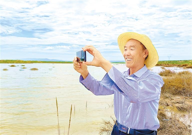 郭萬(wàn)剛格外珍惜這一灘湖水,他沿著水岸走了很久,還不時(shí)地用手機(jī)拍照,他認(rèn)為這是大自然對(duì)古浪持續(xù)開展生態(tài)建設(shè)的回報(bào)。“我今年70歲了,這是我第一次在這片沙漠里見到湖泊,給它取名‘紅沙湖’,希望它像沙漠里的紅柳一樣永遠(yuǎn)充滿生機(jī),不要干涸。”郭萬(wàn)剛說(shuō)。