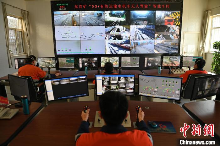 圖為金川集團龍首礦“5G+有軌運輸電機車無人駕駛”智能車間內,操作員正在進行遠程控制。