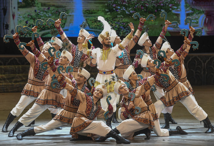 2023年1月2日,甘肅省歌舞劇院的演員在烏魯木齊京劇院表演舞劇《絲路花雨》。新華社記者 王菲 攝