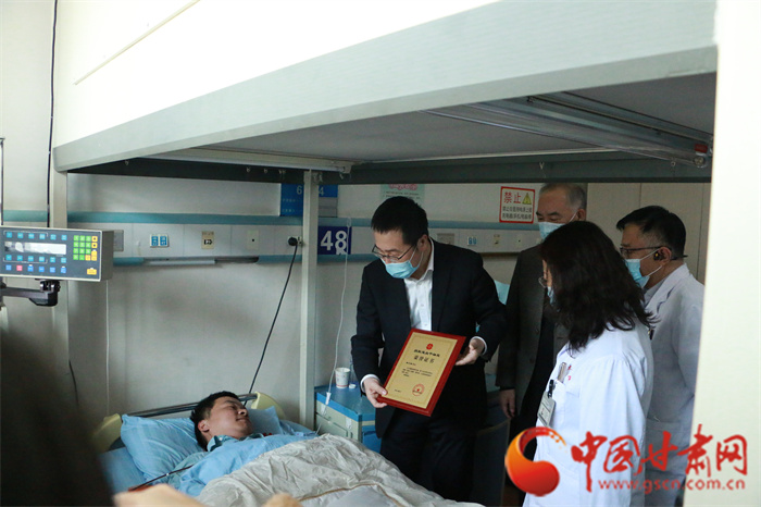 甘肅省紅十字會(huì)黨組書(shū)記、專職副會(huì)長(zhǎng)楊芳勝為甘肅省第54例造血干細(xì)胞捐獻(xiàn)者龔先生頒發(fā)“博愛(ài)金獎(jiǎng)”和榮譽(yù)證書(shū)
